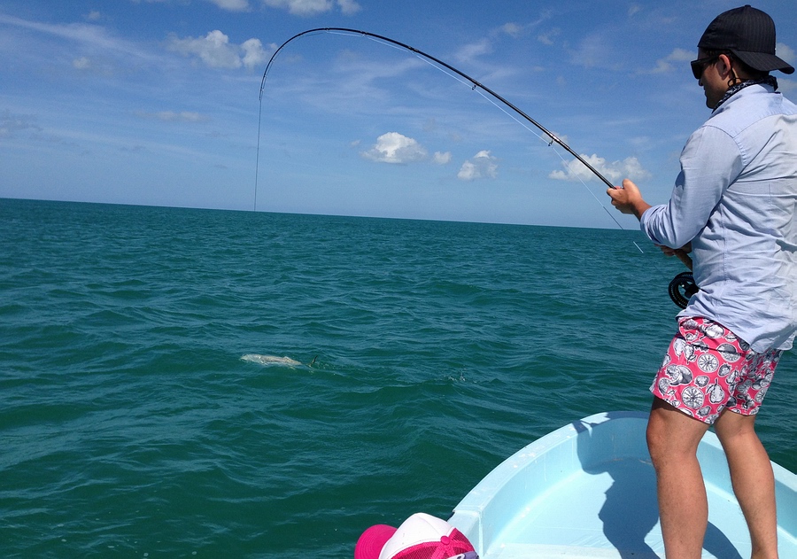Weitere vier Male konnte ich einen Tarpon haken. Drei Mal davon schüttelte der Fisch beim ersten Sprung die Fliege ab. Das vierte Mal verlor ich abermals Fliege und Vorfach. Der Tag schritt schnell voran und auch die Kräfte begannen langsam zu schwinden. Wir bekamen von Alberto Sandwiches als Stärkung zu Mittag gereicht. Zusätzlich gab es Wasser und auch verschiedenste Limonaden waren zur Genüge vorhanden. Die Lebensmittel waren gut in einer großen Kühlbox gelagert, welche auch gleichzeitig für Alberto als Sitz und erhöhte Stehposition zum besseren „spotten“ der Fische diente. Gestärkt durch den Snack fuhren wir auf die andere Seite der Lagune, wo wir erneut eine Schule Tarpon durch das Wasser gleiten sahen. Die Rute in Schnurklasse #10 war schon zur Stelle. 20 Meter vor unserem Boot landete meine Fliege, ein schwarz roter Tarpon-Toad, im Wasser. Ich wartete kurz, um die Fliege in dem mehr als einen Meter tiefen Wasser etwas absinken zu lassen. Abermals ertönte hinter mir „Wait, wait!“. Die Sekunden des Wartens fühlten sich wie eine Ewigkeit an. „Strip, strip, strip“! Und wieder strippte ich so schnell es ging. Kurz darauf spannte sich die Leine und ich konnte den Haken mit dem zuvor bereits erfolgreichen Strip Strike setzen. Der Fisch sprang aus dem Wasser und ich erhielt zum ersten Mal einen vollen Blick auf den rund einen Meter großen silbernen Körper. |