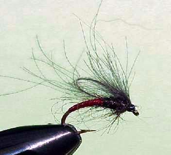 Gekrümmter Haken Größe 14. Als Körper eine Fiber einer Condorfeder. Geht auch mit Fasan. Das dünne Ende einbinden und von Hinten nach vorn wickeln. Im Thoraxbereich festbinden. Eine Entenbürzelfeder nach hinten zeigend einbinden. Jetzt den Thorax aus Dubbingmaterial formen. Ich verwende Berner Sennhund, hat eine tolle Farbe und leichtes Naturfett.