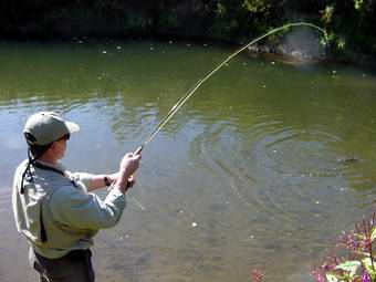 Nach etwa 1,5 Kilometern gelangt man an weitläufige Mäander mit einigen, teils sehr tiefen Pools. Spätestens in diesem Bereich sollte auf das Waten verzichtet werden: durch den lehmigen Grund wird der Fluss trübe, außerdem wird der watende Fischer die Fische eher verscheuchen als fangen. Es gibt jedoch zwei flachere Bereiche, die zum Zweck des Uferwechsels durchquert werden können. Statt dessen ist auf Sicht fischen nach „neuseeländischen Stil“ auf die in diesem Bereich zahlreich vorhandenen Großforellen angesagt. Wir konnten Forellen bis um die 90cm sichten – kein Scherz! |