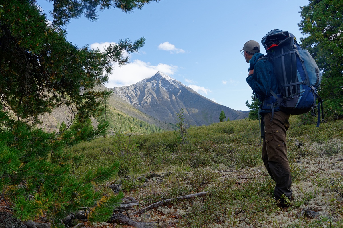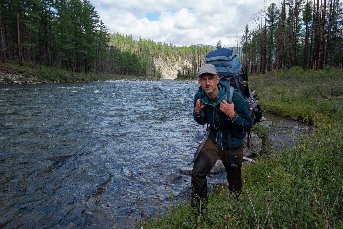 Trotz der vielen Aufregungen am Taimenfluss Shishkhid sind wir mittlerweile schon fast an unserem Etappenziel angekommen, dem linken Zubringer Jolgo Gol [Gol heißt Fluss auf Mongolisch], der unweit der russischen Grenze unseren Ausstiegspunkt bilden soll. Vier Kilometer davor verengt sich das Tal zu einer schlecht einsehbaren Schlucht. Hier einfach „um die Kurve“ zu fahren wäre viel zu gefährlich, das Wildwasser muss zuvor eingesehen werden und es muss klar sein, dass man gegebenenfalls umtragen kann und nicht bei senkrechten Felswänden ansteht. Diese Aufklärung kann durchaus eine Stunde und mehr dauern. Wir entschließen uns zu einem anderen Weg. Nachdem wir es wohlbehalten bis hierher geschafft haben, wollen wir einfach keine Risiken mehr eingehen. Auf der Karte ist zusehen, dass wir das Tal des Jolgo über einen kleinen Pass auch von hier aus erreichen können. Wir tauschen dadurch 4 km gefährliche Wildwasserstrecke gegen eine 7 km Marschetappe, die allerdings mehr als 500 Höhenmeter Anstieg beinhaltet. |