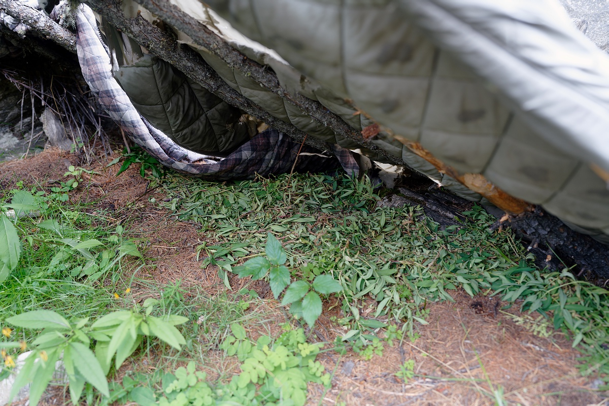 | Schließlich macht sich die Sonne an diesem regenverhangenen Tag doch noch bemerkbar und wir stellen mit Schrecken fest, wie tief sie schon steht. Schon seit Stunden ist uns kein Fleck mehr aufgefallen, der einigermaßen waagrechtes Gelände bietet wo man ein Zelt aufstellen könnte. Noch dazu haben wir kein Wasser mit und hier im steilen Gelände stehen die Chancen eines zu finden schlecht. Werden wir es bis zum Sattel oben schaffen und dort zumindest einen Lagerplatz haben? Bald wird klar – das geht sich auf keinen Fall aus, es setzt bereits die Dämmerung ein. Es bleibt nur die Option eines Biwaks und wieder haben wir über alle Maßen Glück! Wir hören ein leises Plätschern und keine 20 m davon ein nicht allzu steiles Plätzchen, das breit genug für uns beide ist. Wir graben in die Böschung und schichten den Aushub unterhalb an, wo wir Äste zwischen den Bäumen verkeilt haben. So entsteht eine einigermaßen waagrechte Fläche, wo noch Zweige ausgebreitet und die Boote ausgerollt werden. Darüber spannen wir ein Tarp. Ein Feuer wird’s heute nicht mehr geben, stattdessen wird Schokolode gereicht, die garniert mit den letzten Tropfen Wodka für gute Stimmung sorgt. |