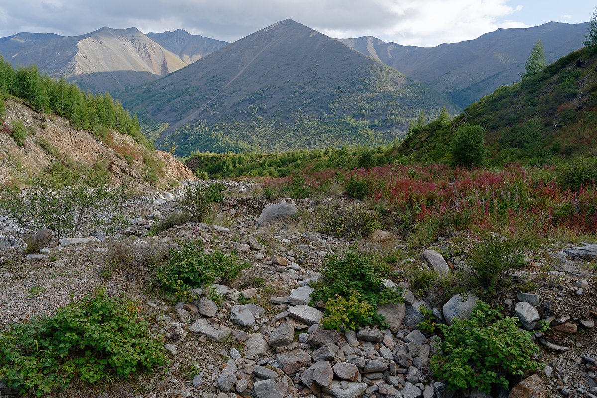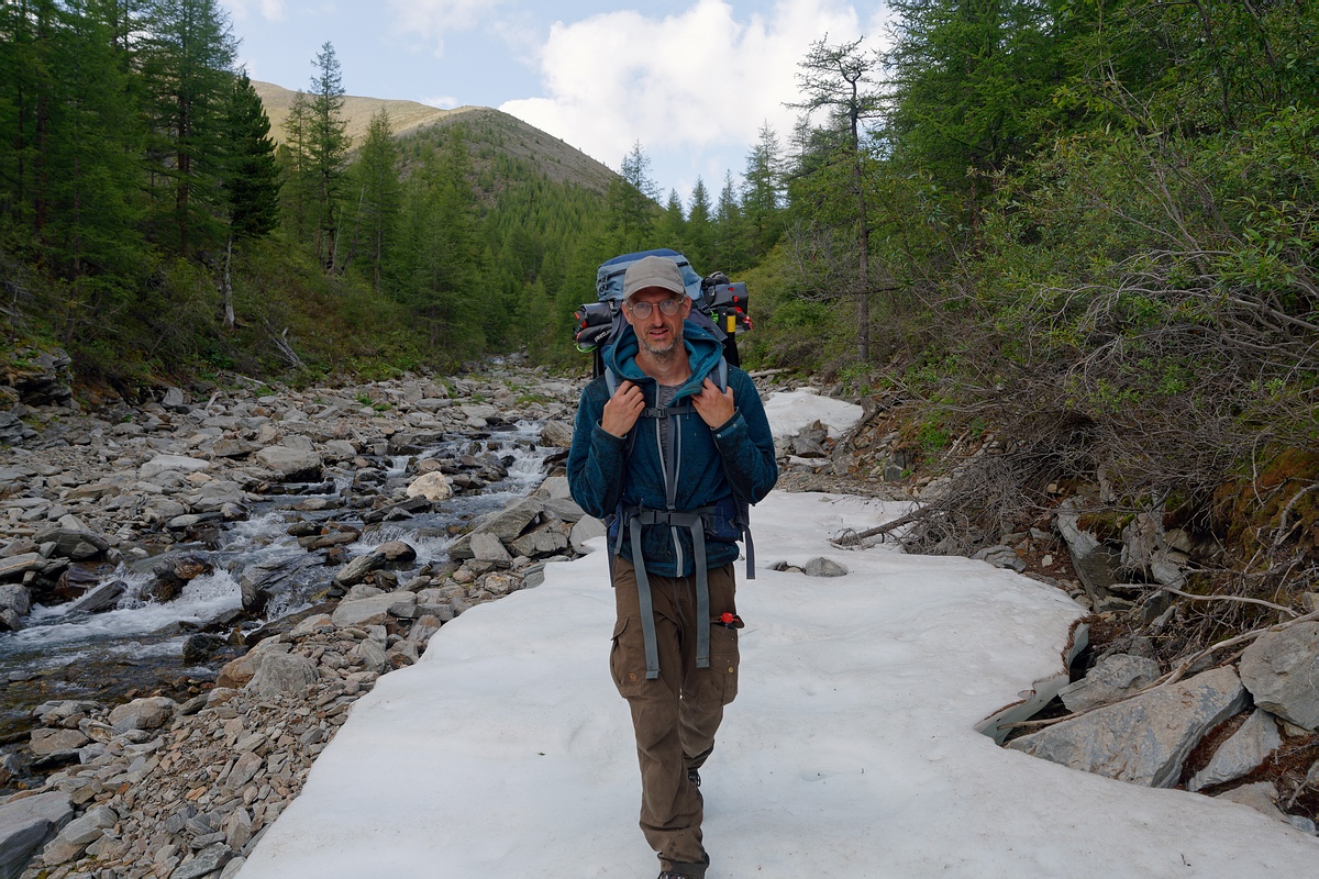 Schwer bepackt steigen wir also aus dem Flusstal in die Taiga des nördlichen Abhangs. Offensichtlich sind vor wenigen Jahren hier sehr große Flächen abgebrannt. Man möchte meinen, dass solches Waldbrand-Gelände ein günstigeres Marschgelände bietet als dichter Wald. Das trifft aber nicht zu. Es liegen Stämme und Äste kreuz und quer, die ständig umgangen oder überklettert werden müssen, dazwischen rankt teils dorniges Gestrüpp. Vor dem Anstieg machen wir mit großer Verspätung Mittagspause in einem trockenliegenden Bachbett. Völlig durchnässt müssen wir paradoxer Weise länger auf die Suche nach Wasser zum Kochen gehen und finden zum Glück einen kleinen Tümpel im Wald. Im weiteren Verlauf wird das Gelände steiler, die offenen Flächen der Hänge sind noch schlimmer. Sie sind mit dicken Torfmoospolstern bewachsen, wo man bei jedem Schritt dezimetertief einsinkt. Unsere Fortbewegung wird hier quälend langsam und extrem anstrengend. |