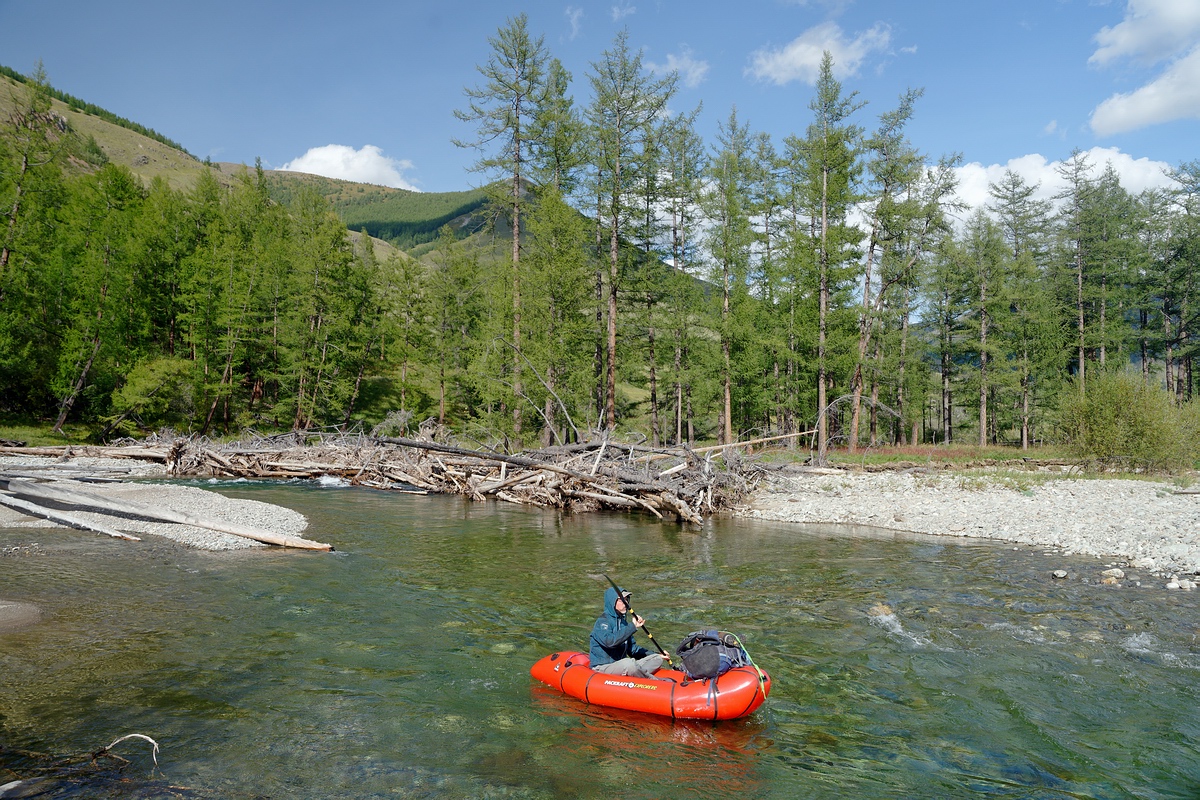 | Im weiteren Verlauf mäßigt sich das Gefälle des Hug und der Fluss holt zu immer weiteren Schlingen aus, die die gesamte Talbreite umfassen. Er bildet wunderschöne tiefe Züge, wir sind vom glasklaren, türkisgrünen Wasser ebenso begeistert wie von den traumhaften Strukturen und Fischeinständen. Es ist kaum zu glauben, dass hier nicht auch Taimen vorkommen. Ich lasse wiederum die Rehhaarmaus über die besten Stellen furchen, aber kein Großfisch stürzt sich auf das reizende Angebot. Sogar die ersten, sporadischen Lenoks finden wir erst am dritten Bootstag auf dem Hug. Rückblickend wäre es besser gewesen, die unglaublich gute Trockenfliegenfischerei auf Äschen in vollen Zügen zu genießen, als sich mit der erfolglosen Großfischsuche aufzuhalten. |