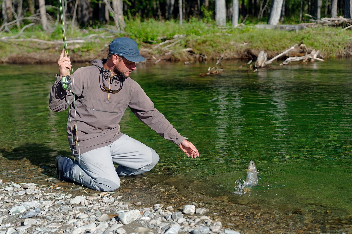 | Zu früh gefreut, denn schon steht senkrechter Fels an, der eine Querung erfordert. Der Fluss ist im Gegensatz zum Shishkhid eiskalt, und an guten Stellen gerade eben seicht genug für eine Querung. Die Schuhe sind sowieso nass (und werden das die ganze Woche lang bleiben), wir queren also mit dem normalen Schuhwerk. Die wunderschöne Landschaft entschädigt für die Strapazen, und ein zwei mal stecken wir unterwegs die Rute zusammen um zu fischen. Neben den fast allgegenwärtigen, vorwiegend kleinen Äschen geht in einem größeren Kolk – der Unterlauf besteht ansonsten fast nur aus eher seichten, rasch fließenden Rauschen – ein schöner Lenok an den Haken. Leider flüchtet er beim Fotoshooting und bleibt undokumentiert. Der Jolgo wäre groß genug, um auch Taimen Lebensraum zu bieten, und so beschäftigt uns die Frage, ob wir in den größten Kolken auch solche hier finden können. Nach der Antwort suchen wir mit Hilfe der Rehhaarmaus, die sich zuvor als effektiver Taimenköder erwiesen hat. Leider ohne Interessenten. |