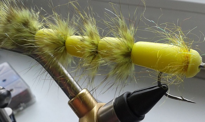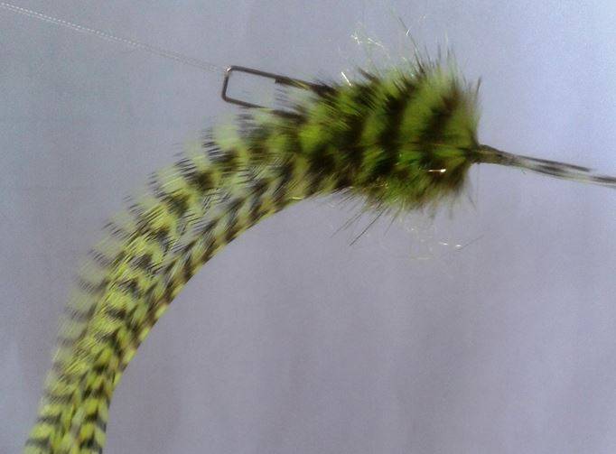 Der „earplug hover“ wird, wie der Name es ausdrücken soll, schwebend unter der Oberfläche geführt. Die Ohrenstöpsel nehmen minimal Wasser auf, dieses führt dazu, das der Streamer wie schwerelos und nur leicht sinkend unter der Oberfläche fischt. Bei Zug entstehen durch den voluminösen Kopf und den an der flexiblen Backing-line aufgefädelten Ohrenstöpsel eine Menge Verwirbelungen, Blasen und Geräusche unter Wasser. Durch die Anordnung der Ohrenstöpsel auf der Backingline ist das Hinterteil flexibel und tailt doch nicht ein. Die Saddle Hackles spielen schön, ebenso wie die Marabou Fibern im Vorderteil der Fliege. Eines soll aber nicht verschwiegen werden: durch die minimale Aufnahme von Wasser durch die Ohrenstöpsel hat der Streamer natürlich ein klein wenig Gewicht mehr auf den Rippen. Durch Druck mit den Fingern auf die Ohrenstöpsel kann das Wasser aber leicht ausgedrückt werden. |