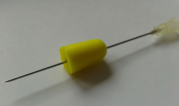 Das hilft mir, beim Durchstechen mit der Nadel möglichst zentrisch durch den „earplug“ zu kommen. |
