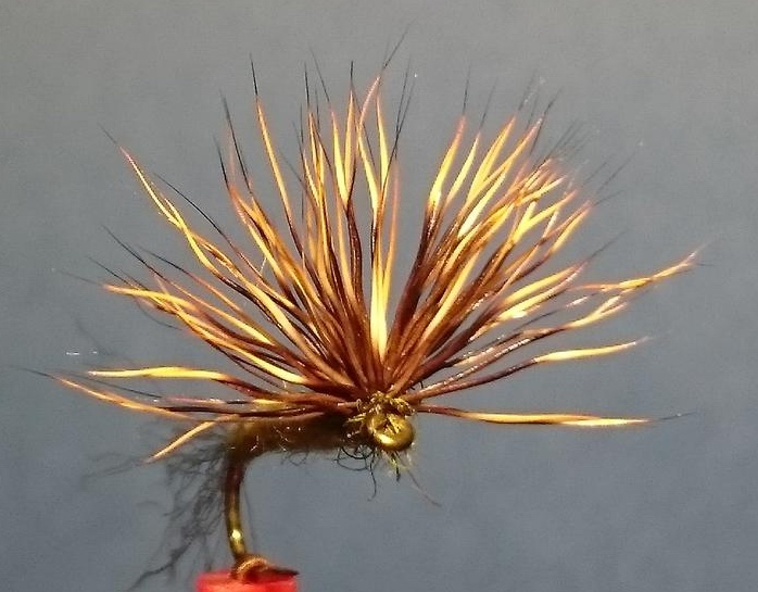 Bindefaden: Ultra Thread 70 brown-olive Schwanz: Mallard Flank Wood Duck gold Rippung: Micro Floss 110 darkbrown Abdomen: Poly II Dub Golden Amber Unterflügel: Deerhair died yellow Flügel: 2 Ccd-Federn olive Hechel: 2 CDC-Federn gelb und dark-olive im Split Füße: Rehhaar braun, getrocknet Petri! Christian |