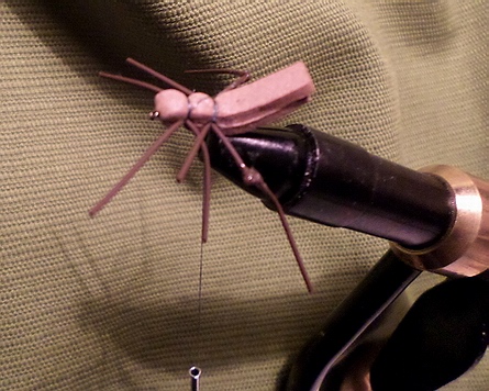 Haken: Trockenfliegen Haken Size 12 Flügel: Rehhaar Unterbau für Körper: Moosgummi-Reste Körper: Moosgummi braun Beine: Rubberlegs verknotet Weitere Materialien: Alleskleber/Sekundenkleber, Rasierklinge oder Skalpell, schwarzer wasserfester Stift Die Rubberlegs habe ich übrigens nach diesem Spartip gewonnen: (Link) Bindeanleitung: