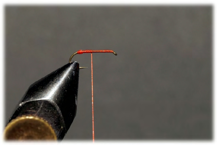 Zuerst wird der Haken eingespannt und eine Grundwicklung bis zum Beginn des Hakenbogens gelegt. Dort angekommen formt man einen kleinen Knubbel, „Oarscherl“. Dieses Bewirkt dass anschließend die Ginger Fiebern schön abgespreizt werden. Danach den Faden bis etwas über die Hakenspitze zurückführen. |