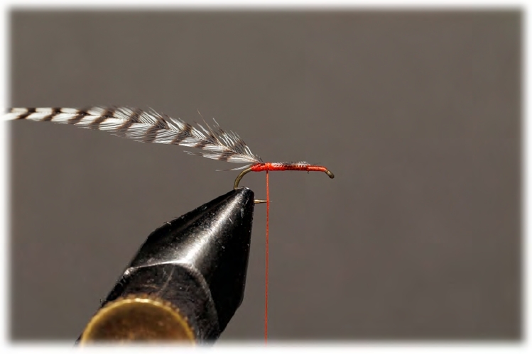 Nun kann die Hahnenhechel ebenfalls nach vorne gewunden und abgebunden werden. Um keine Fiebern in den Kopfknoten mit einzubinden, habe ich über meinem Bobbin einen kleinen pinken Gummischlauch, mit dem ich die Fiebern zurückschieben kann. Nach dem Kopfknoten (der eventuell lackiert werden kann), schneide ich die Fiebern unterhalb des Hakens ab, sodass das Oarscherl satt auf der Oberfläche aufliegt. |