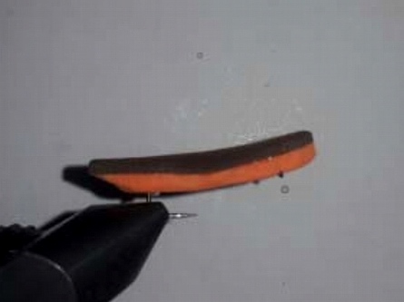 | Mit dem Kugelschreiber wird nun mit Hilfe der Schablone (langgezogene Raute) die Form nachgezeichnet. Anschließend bekommt sie mit dem scharfen Messer einen Querschnitt für den Kopf und dann mittig noch einen angepasst auf die Größe des Hakens. | Der Haken wird mit Kleber bestrichen und der Körper am Längsschnitt drauf gedrückt. |