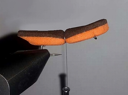| Nachdem der Kleber trocken ist, wird das Bindegarn mehrmals kurz vor der Hakenspitze um den Körper gelegt. | Als Erstes wird das Egg Yarn als Blickpunkt eingebunden, danach die zwei Doppelbeine an beiden Seiten. |