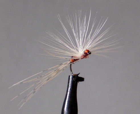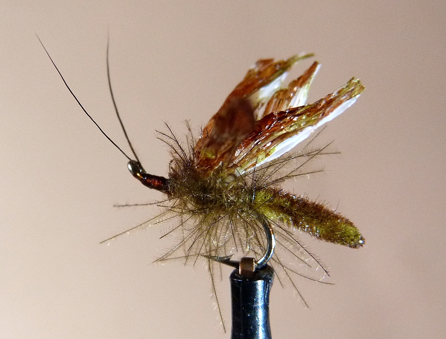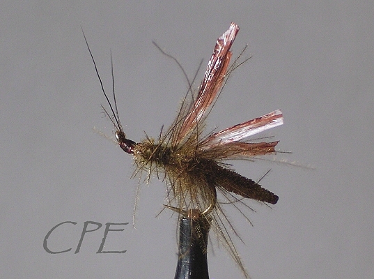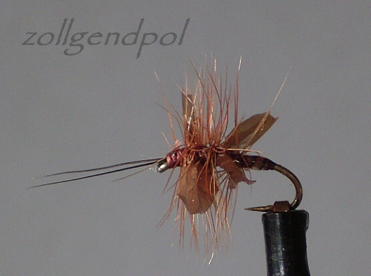 6. Faden auf ca. den Hakenpunkt legen. 7. Hinteres Flügelpaar einbinden. 8. Faden 1,5 mm nach vorne nehmen. 9. Vorderes Flügelpaar einbinden. 10. Faden nach hinten nehmen. 11. Dubbingschlaufe festlegen, dabei auch um die Schlaufe herum winden, damit kein Abstand zwischen den beiden Schlaufen-Schenkeln liegt. Dubbing Twister einhängen. Tacky Wax aufbringen. 12. Faden nach vorne nehmen. 13. CDC-Klemme auf Schlaufe legen, so dass die CDC-Fibern ankleben. An Twister ziehen, so dass die Schlaufe aufeinander liegt. Schlaufe gründlich verdrillen. 14. 3-4 Wicklungen hinter den Flügeln, 2-3 Wicklungen zwischen den Flügeln, Rest der Wicklungen vor den Flügeln. Mit Faden festlegen. 15. Kräftigen Kopf formen. Festlegen. 16. Hinter Flügel auf etwas über Extended Body ablängen. Vordere Flügel etwas länger lassen. Optional Flügel zuspitzen. 17. Flügel oliv einfärben. Flügel, Body und Köpfchen braun einfärben. 18. Bindelack auf Kopf aufbringen. 19. Fertig. Mit freundlichen Grüßen, Norbert Name: General