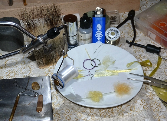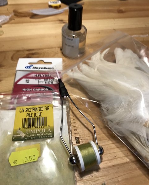Für den „Semicircle Spinner“ (Videolink) hatte ich nicht das richtige Material auf der Hütte, also nochmals die „Flytier’s Masterclass“ vornehmen. Der „Yellow May Emerger“ – der wär doch was. Zumindest halbwegs passende Swimming Nymph Hooks in #18 hatte ich dabei – und der Rest wird sich schon finden. |