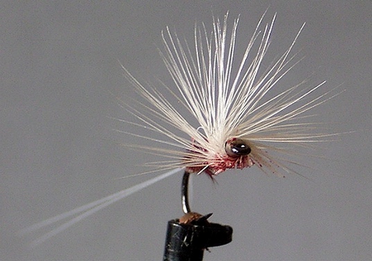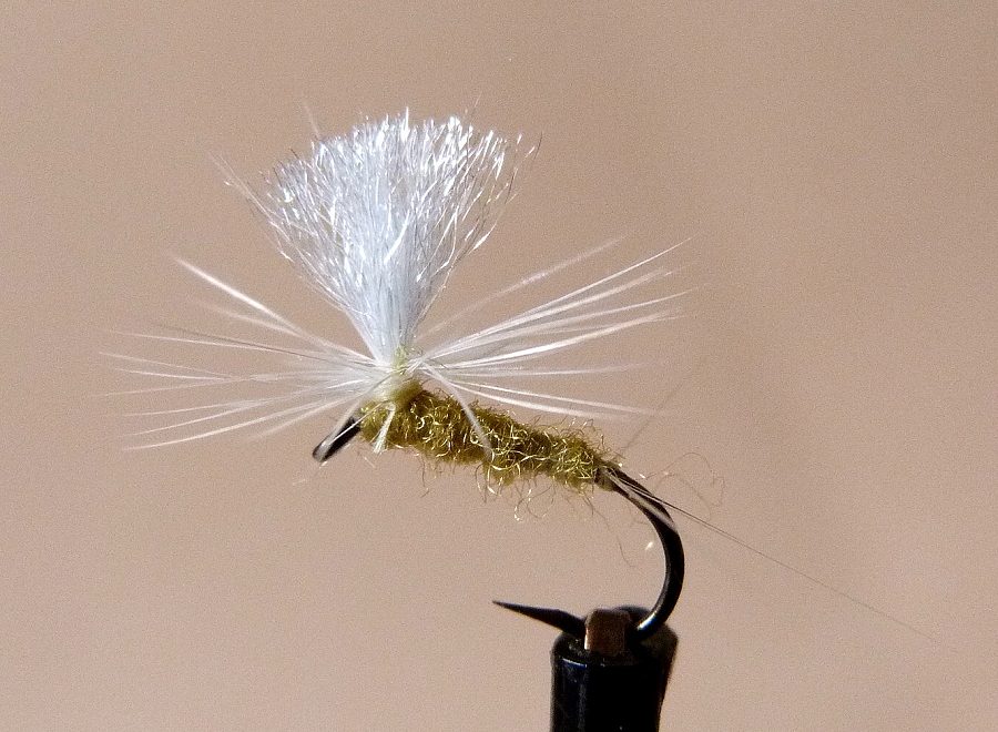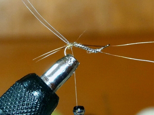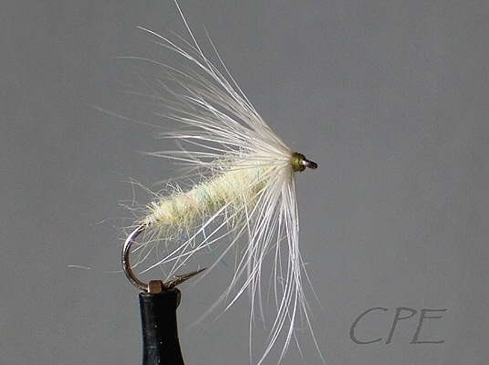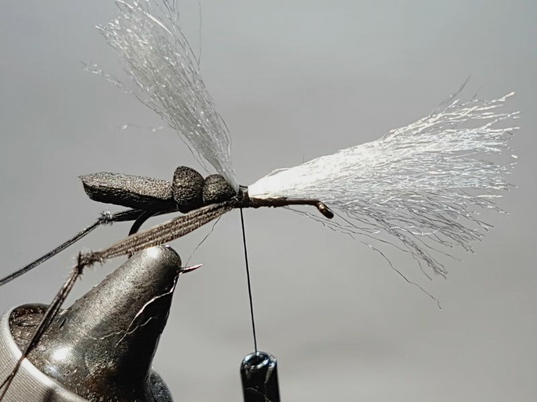 15. Die Faltenspitze unmittelbar vor/über dem Dubbing mit „Pinch and Loop“ einbinden. Dabei die Flügel seitlich und ganz leicht abwärts ausrichten. 16. Die Flügel zuschneiden – max. Länge bis knapp über den Hakenbogen, ggfls die Spitzen trimmen. *) she Anmerkung 17. Einige Fiebern einer CDC-Feder abschneiden und rund um den Haken einbinden (max 5 – 7 mm lang). Zu lange CDC-Fiebern abkneifen. 18. Einen ca. 2 mm breiten Baststreifen nach vorne weisend, direkt am Öhr einbinden. Hinteren Überstand abschneiden. 19. Faden wachsen. Die Augen, ggfls mit Hilfe einer spitzen Pinzette, quer hinter dem Öhr einbinden. 20. Dubbing anspinnen und mit Achterwicklungen um die Augen den Kopf formen. 21. Es wird wieder Zeit für einen Tropfen Lack! 22. Bast nach hinten umklappen und festlegen. Überstand abschneiden. 23. Faden wachsen, Dubbing anspinnen und den Thorax formen. 24. Ein letztes Tröpfchen Lack auf den Faden aufbringen und Whip finish hinter der Kopfkapsel. 25. auch nachzulesen und genauestens illustriert bei O.E. „Fytier’s Masterclass“ S. 45ff |