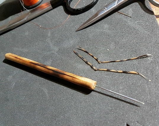 | Als Vorderbeinchen kann man außer Fasanenschwanzfibern ebenso gut eine schwarze Hennenhechel oder auch CDC-Fibern verwenden. Für die kräftigen Hinterbeinchen gilt das ebenso. Auch feine schwarze CDC-Federn sind sehr attraktiv und schnell einzubinden. Falls man knoten will, sollten nur Fibern von großen Fasanenschwanzfedern (Center-Tail) erster Güte verwendet werden, sonst ist es eine Tortur. Auch eine große Reiherfeder o.ä. kann verwendet werden. Gegebenenfalls mit wasserfestem Edding schwarz einfärben. Die richtige Farbe ist viel wichtiger als der "Knick", der bei den leblos dahintreibenden Bibios ohnehin nicht mehr vorhanden ist. Die Hinterbeine hängen dann gerade nach unten. |