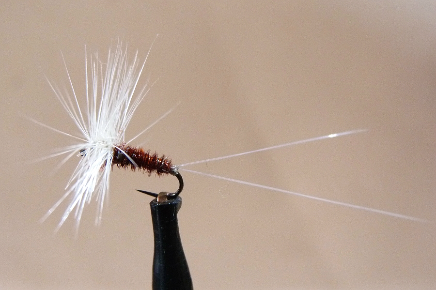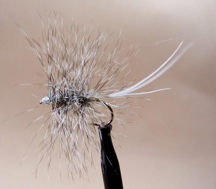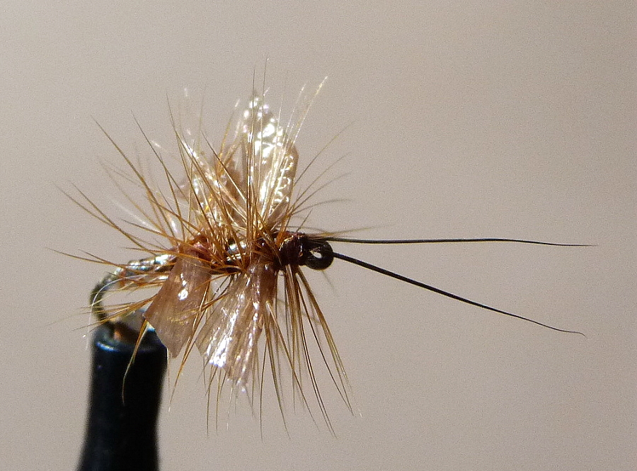 Die Fasanenfiebern in engen Windungen bis ans Öhr führen und dort abbinden. Ein kleines Köpfchen formen. Sicherheitshalber mal ein Whip finish oder Halbschlag. Bindefaden hinter die Hechel führen und ablegen. Die Hechel in möglichst schnellen Windungen ca. 5 mal nach vorne und wieder zurück wickeln. Mit dem Bindefaden abfangen und nach hinten überstehende Fiebern abschneiden. Bindefaden etwas aufdrehen und als Rippung nach hinten führen. Am Ende mit Whip finish abschließen. Ein Tröpflein Lack darauf geben. Nun wird die Hechel unten beschnitten – und zwar kräftig bis zur Waagerechten! Die Fliege soll vollkommen plan auf dem Wasser aufliegen. |