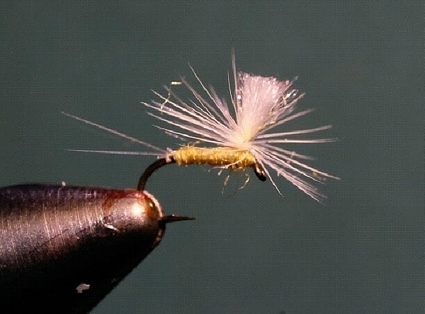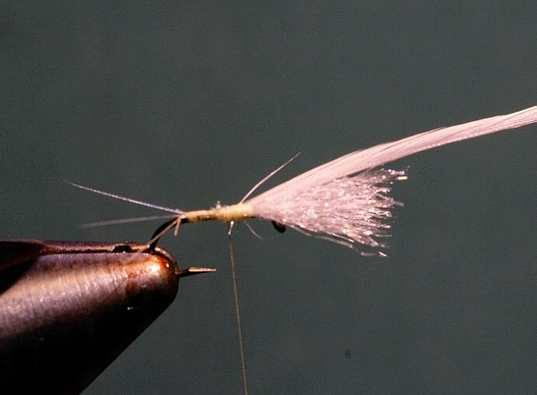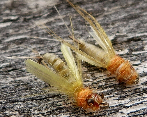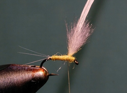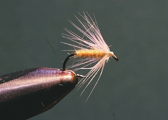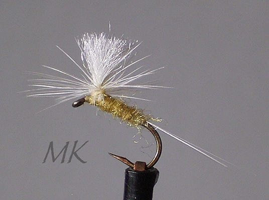 | Nach einigen Versuchen und Testfliegen hatte ich mich dafür entschieden – allerdings mit kleinen Änderungen zum Original. Beim Material verwende ich als Schwänzchen die hellen Spitzen vom Dachshaar (wer will, kann sie ja noch gelb anmalen – ich glaub, dass dies nicht sehr bedeutsam ist). Bei den Bindeschritten fiel mir eine manchmal etwas andere Vorgehensweise einfach leichter und ich hab nicht den Eindruck, dass die Gesamtoptik oder gar die Fängigkeit davon beeinträchtigt wird. O.E. wird’s mir bestimmt nachsehen ;-) |