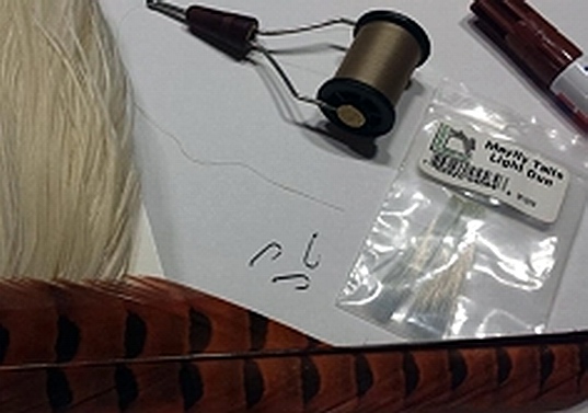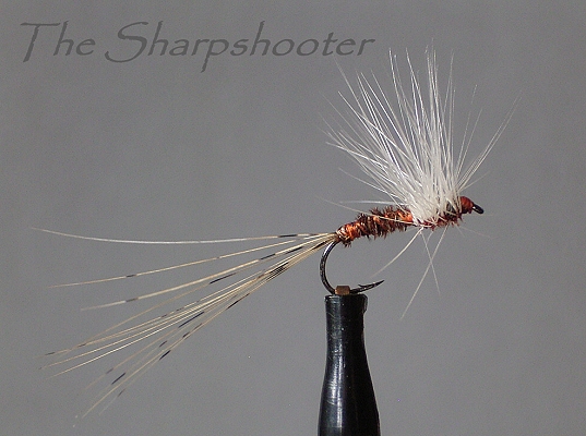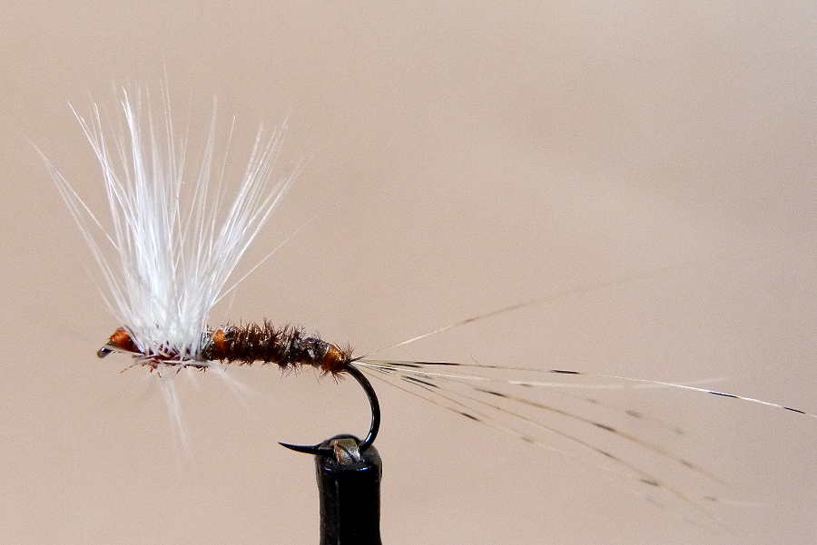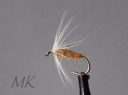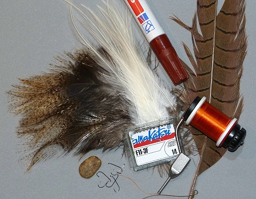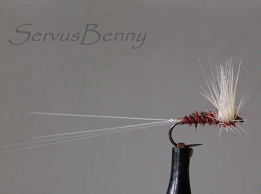 Haken: Gamakatsu F11-3F # 14 Bindefaden: Ultra Thread 70 brown (in dem Fall „burnt orange“) Schwänzchen: Coq de Leon, hell (Tail Pack) Rippung: Bindefaden Körper: Fasanenstoß Hechel: weißer Hahn Sonstiges: brauner Edding, Lack, Veniard-Wachs Bindeanleitung