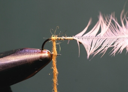Die zwei CDC-Fibern werden von oben nach unten senkrecht zum Kiel ausgerichtet und Spitze an Wurzel aufeinander gelegt. Dann werden beide Federn in die Nut des CDC-Werkzeugs gelegt. Liegen die Federn sauber drin, werden die Fibern auf gleiche Länge abgeschnitten. Dann werden die Fibern in die CDC-Klemme übernommen und die Kiele so entfernt, dass mindestes 3-4 mm aus der Klemme hervorstehen. Diese Fibern werden auf die mit Soft-Wax bestrichene Fadenschlaufe gelegt und mit dem Dubbing Twister verzwirbelt. Damit haben wir eine Dubbing-Raupe, die unseren Körper bilden wird. Bindeanleitung