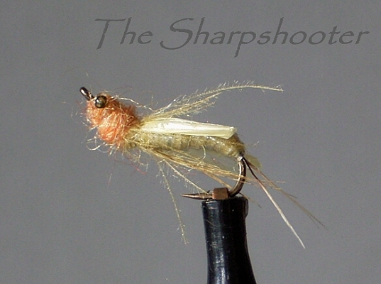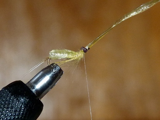 Haken: Swimming Nymph Hook # 16 Faden: Veevus G02 30G weiß (farblos); Beschwerung: Leadfree Wire .015, flachgeklopft; Lack: Hydro Coat und Nail Hardener; Schwänzchen: 2 Haarspitzen cremefarben vom Dachs; Abdomen: Dubbing-Mix Antron Jaune pale & Poly II Golden Amber, Flexibody durchsichtig; Thorax: Dubbing-Mix s.o. + Oldrich Dvorak 312 (orange); Beinchen: Fiebern einer Mallard Flanc yellow (mit Hydro Coat behandelt); Hechel: CDC Swiss light olive; Flügel: Raffia golden olive; Augen: dunkles Monofil, verschmolzen; Kopf: Raffia goldgelb; Sonstiges: Feuerzeug, Veniard-Wachs, Pinzette