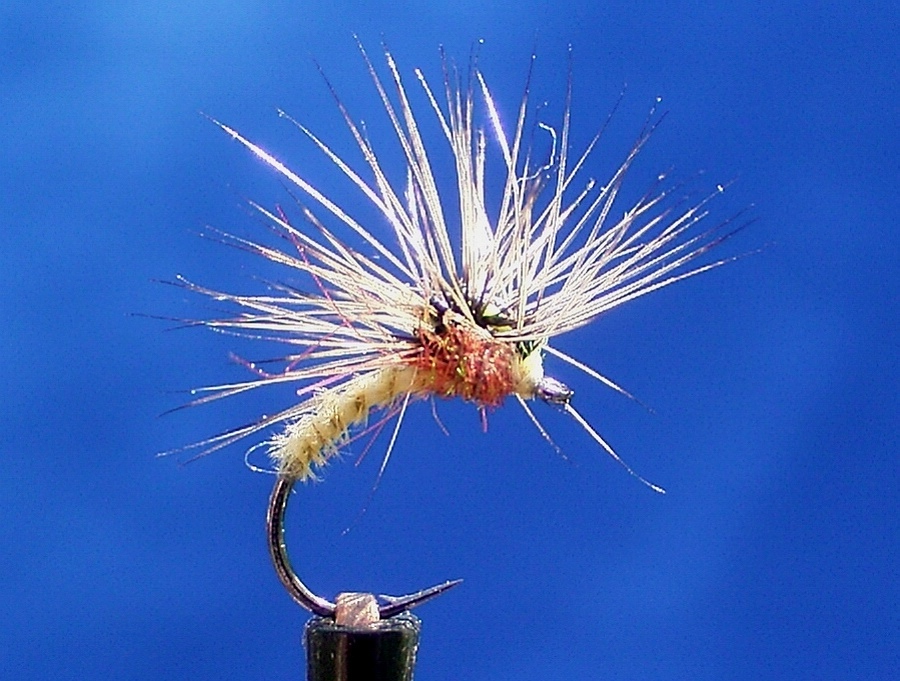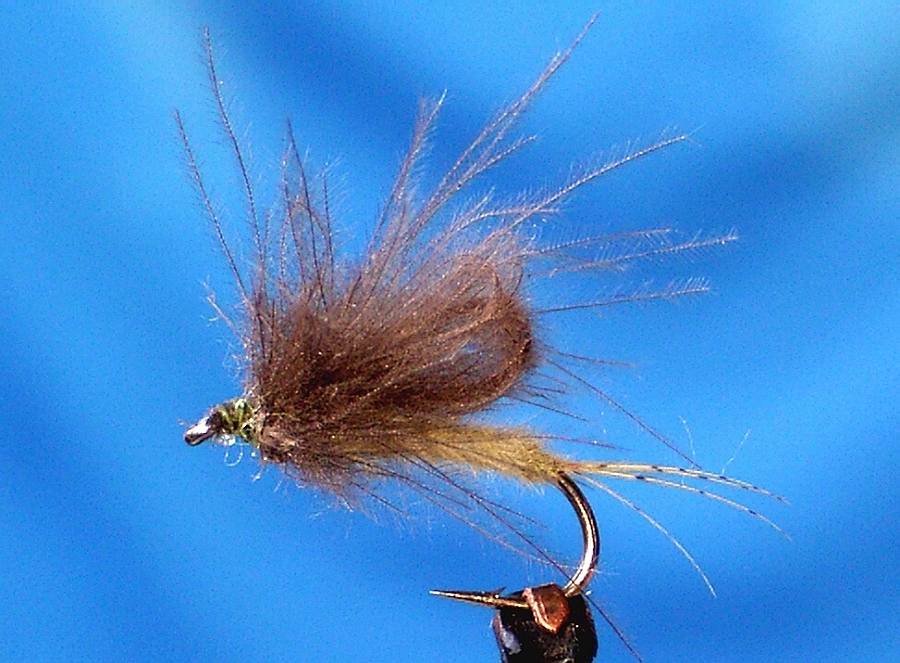 Haken: TMC 2487 Bindefaden: Veevus 10/0 schwarz Körper: brauner Biot Streifen Thorax: SWISS CDC Arctic Fur Dubbing Dark Brown Flügel: cremefarbenes Rehhaar Bindeanleitung: |