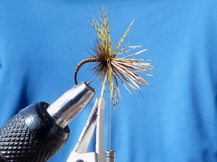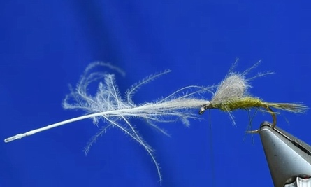 Dann den Rest der Feder nach hinten schlagen und mit 2 Wicklungen auf der Feder sichern. Dort auch die Fliege mit dem Kopfknoten abschließen. |