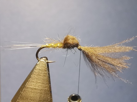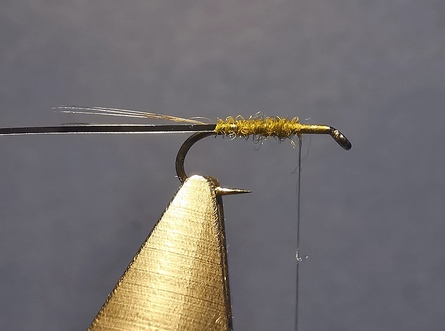 2 CDC Federn mit den Spitzen zum Hakenbogen einbinden. Mit dem Dubbing den Thorax formen |