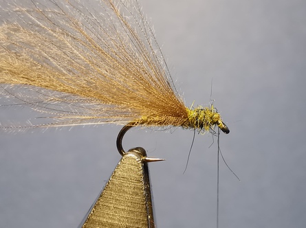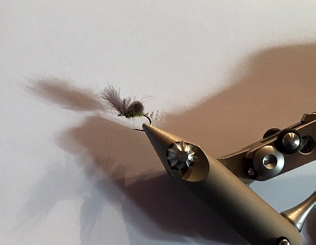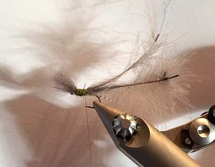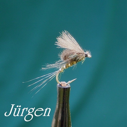 Haken: gerader Haken #14 Faden: Sheer in oliv Schwänzchen: 5-7 Grannen von einer Entenbrustfeder gelb Körper: CDC oliv Loop und wing: jeweils 1 CDC blue dun Bindeanleitung: