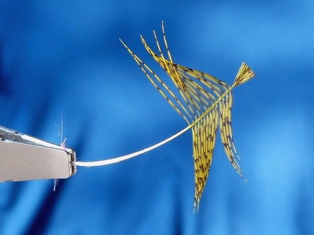 | 13. Die Partridge-Feder vorbereiten | und mit der Spitze voraus nach vorne und mit der natürlichen Biegung nach oben weisend einbinden. (ca. 1- 2mm vor dem Flügel). |