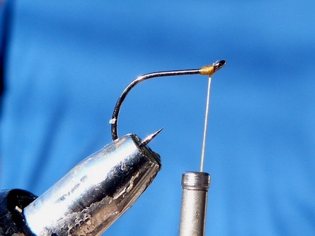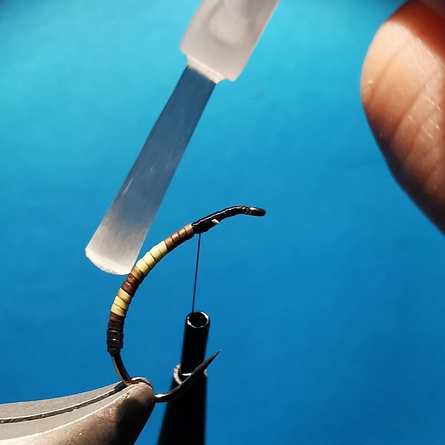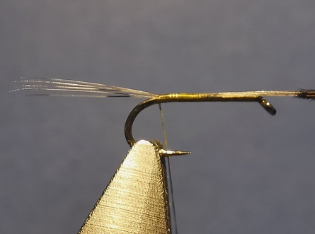 9. Den Quill auf dem Haken einbinden (ich bevorzuge es, ihn mit der Spitze nach vorne einzubinden damit die Rippung zum Thorax hin breiter und damit natürlicher wird) |