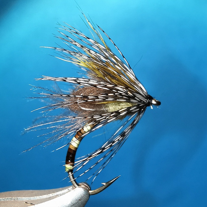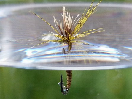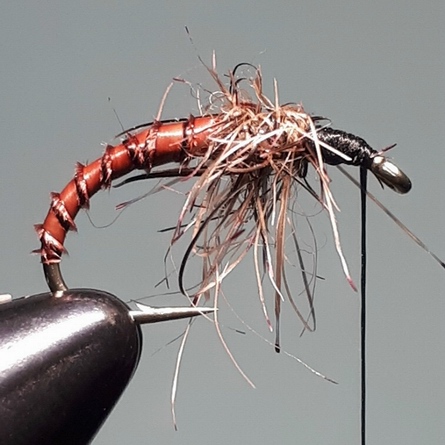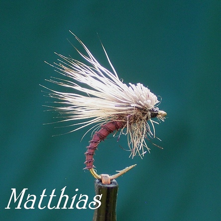 Köpfchen mit einem Tropfen Lack sichern. Viel Spaß beim Nachbinden! Die Fliege kann in Größe 10 bis 18 gebunden und gefischt werden. |
