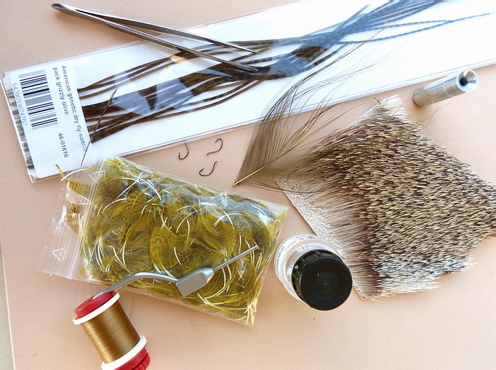 Haken: Kamasan B100 bronze #10 Körper: Peccary olive Flügel: 2 CDC natur, Rehhaar olive Thorax: Squirrel Dubbing olive Hechel: Rebhuhn Bindenanleitung: |