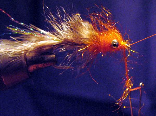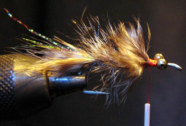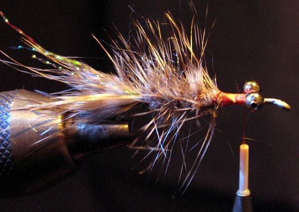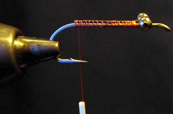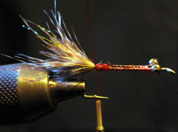 Dubbing bis etwa 3mm vor den Augen aufdubben. Dann Körperhechel anbringen und mit Rippung abfangen. |