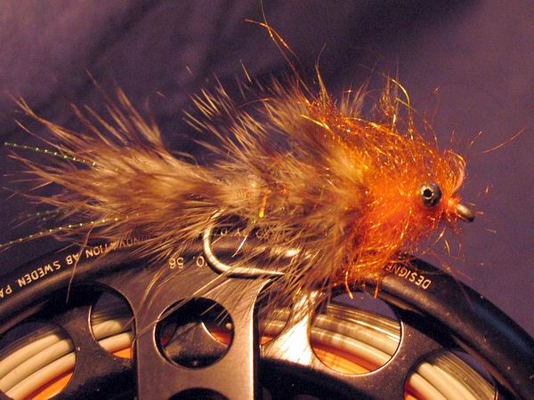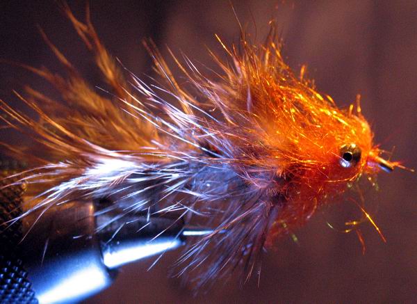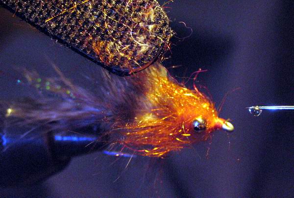 Dubbing in Schlaufe drehen und leicht ausbürsten. Das ganze um die freibleibende Stelle am Haken, sowie die Augen winden und abbinden. |