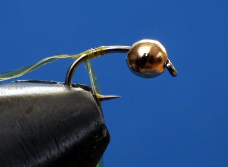 den Haken mit der montierten 2mm Tungstenperle in den Bindestock und binden