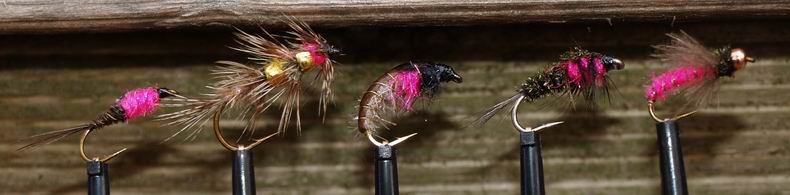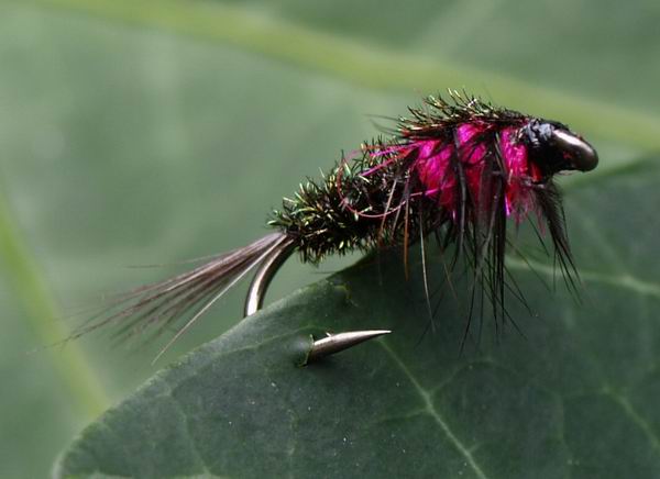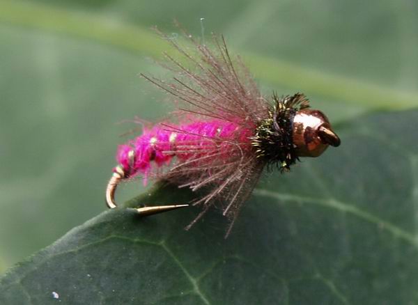 Haken: Gr. 14 Hinterleib: Rosa Dubbing mit Lureflash gerippt Thorax: Pfaugras Hechel: CDC-Fibern Kopf: Tungstenperle, kupfer |