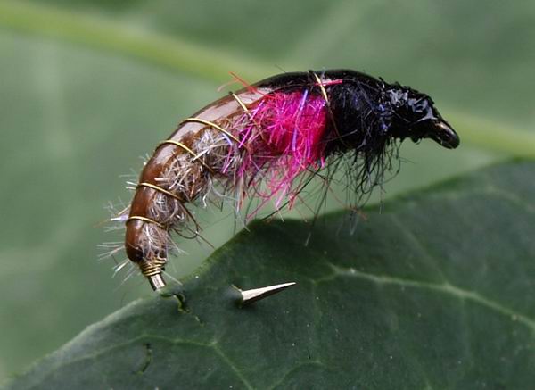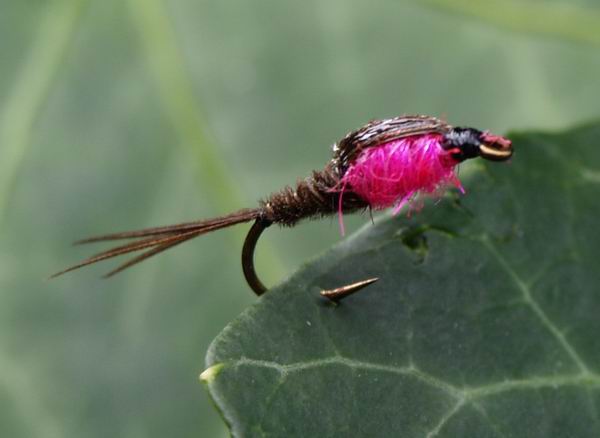 Haken: Gr. 12, Buckelhaken Hinterleib: Dubbing, braun Thorax: Rosa Dubbing, davor schwarzes Dubbing Rücken: braune Folie, das vordere Drittel mit Edding schwarz gefärbt Rippung: Kupfer- oder Messingdraht Beschwerung: Bleidraht |