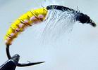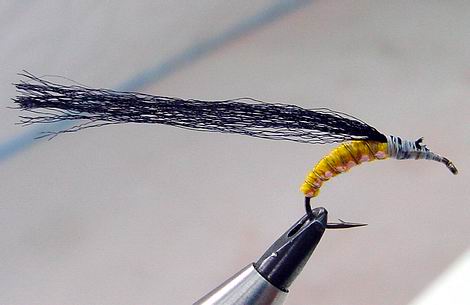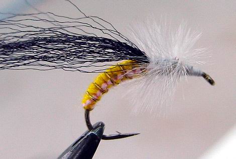 hier gelb und weiß, mittig vom Haken eingebunden, der Gelbe vom Öhr