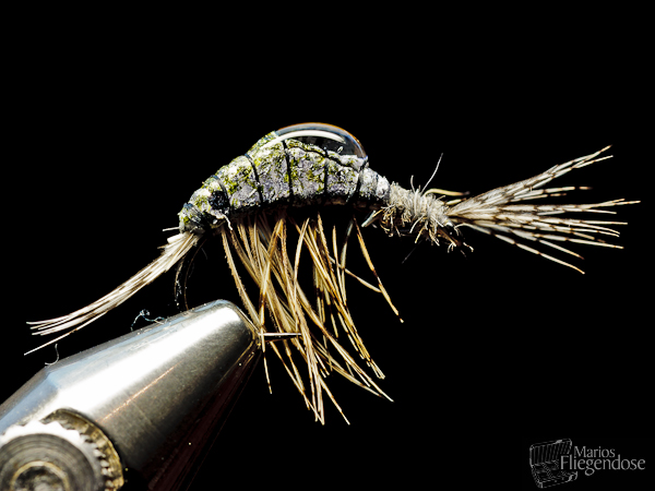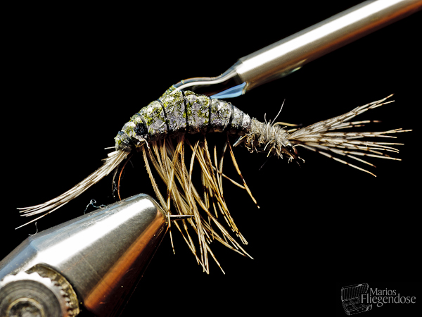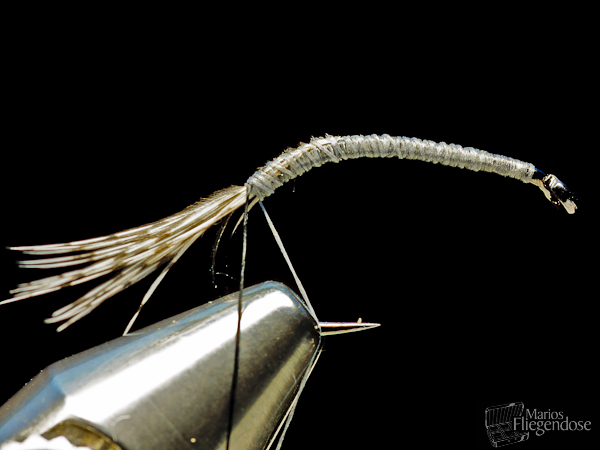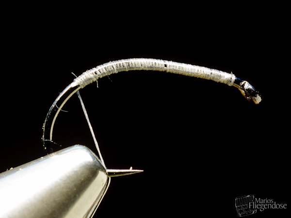 (9) Mit feinem Dubbing wird der Übergang vom Soft Tungsten Body zum Öhr ausgefüllt. Ein Kopfknoten unterhalb der Fühler stellt diese etwas auf. Die Bindephase ist abgeschlossen. |