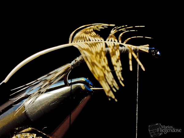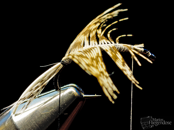 Die Spitze der Feder im vorderen Teil der Fliege oben aufliegend einbinden. |