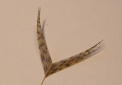 eine Perlhuhnfeder so ein, das sie mit den Spitzen eingebunden wird und