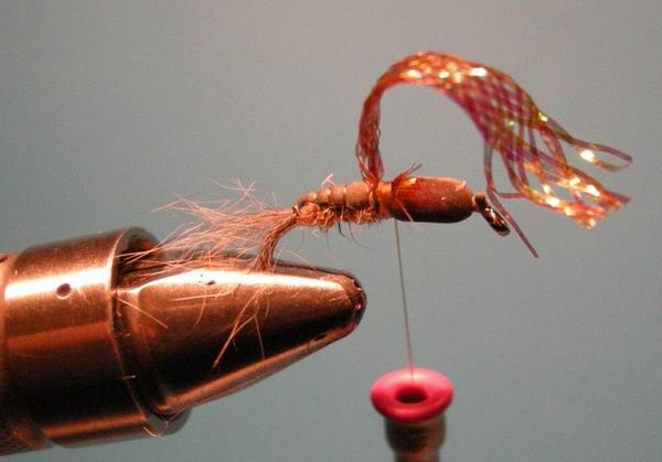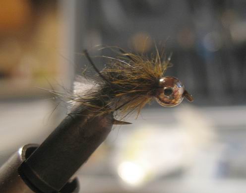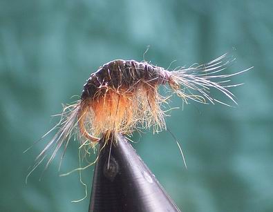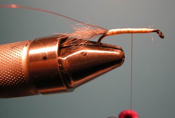 | Dann noch etwas lockeres Dubbing als Beinchenimitation unter dem Thorax des Nymphenkörpers aufbringen und den Nymphenkörper vorne mit Hilfe des kleinen Überstandes festbinden. | ![]() |