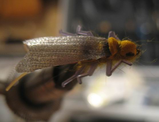 Eines vorweg: Wie oben gesagt habe ich hier Foam benutzt, damit hat das Muster Auftrieb wie ein Korken. In Verbindung mit dem Schwanz ein Never sink Muster. Zuerst wird die Grundwicklung auf einen Haken der Größe 10 (TMC 100) aufgebracht. Danach den Stonefly Schwanz einbinden und mit wenig Superkleber gegen das Verrutschen sichern. Nun habe ich ein 4 mm breites Stück Foam nach hinten stehend eingebunden und die Beine. Mit Dubbing und Kreuzwicklungen den Grundbody geformt. Dann als Rückenpanzer das Foam nach vorne geklappt und abgebunden, wieder etwas Dubbing und die Buckel damit geformt. Das Foam wieder darüber geklappt, die Flügel ausgetanzt und eingebunden. Das nach vorne überstehende Foam einbinden. Mit Dubbing den Kopf geformt und das Foam darüber nach hinten geklappt und gesichert. |