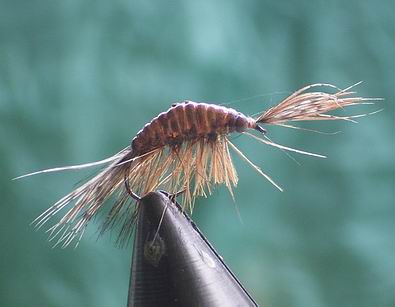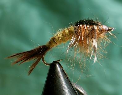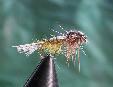 Das ist ein einfaches Muster, welches ich eigentlich immer mit Bleiband binde. Der Haken ist der gleiche wie bei der Stoneflynymphe. Einfach mit der Grundwicklung anfangen, danach die Strange so zurechtschneiden, das ein langer unten eingebunden wird und ein kleines Stück oben auf den Haken. Dadurch bekommt man die gewünschte Form und sie schwimmt in der richtigen Lage im Wasser. Danach eine kleine Dubbingkugel hinten einbinden und die Biots von der Gans links und rechts einbinden. Nun einfach mit dem Dubbing den Unterkörper formen und mit dem Draht rippen. Etwas andersfarbiges Dubbing für den Vorderkörper verwenden. Einen Teil davon aufspinnen und danach eine Wicklung machen. Nun bindet man als Flügelansatz eine Perlhuhnfeder ein, wieder eine Wicklung mit dem Dubbing machen und noch |