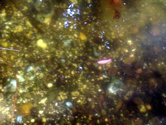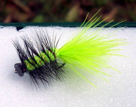 Ich versuchte daraufhin den Pink- Chartreuse-Streamer (Foto links), auch mit Taumelscheibe. Das selbe schöne Spiel wie beim Vorgänger massierte meine Augen, nur, dass diesmal der ganze Körper durch das weiche Marabou in Bewegung versetzt wurde. Dieses mal hatte ich es auf einen Schwarm abgesehen, der ca. 20 m vor mir entfernt war. Keule raus, Zugunterstützung und der Streamer landete inmitten der Forellen, die sich von dem Platschen des Streamers nicht stören ließen. Kurz absinken lassen und 2 Strips später hatte ich einen Biss. Die Forelle biss dermaßen vehement, dass ich der Meinung war, dass ein Anschlagen überflüssig sei... So blieb der Fisch nur 3-4 Sekunden hängen und verabschiedete sich mit einem Sprung.. Hätte ich doch mal angeschlagen! |