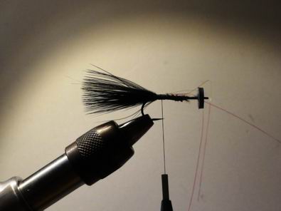 1.: Taumelscheibe auf Haken ziehen, Haken einspannen und Grundwicklung legen. Dabei etwas mehr hinter der Taumelscheibe auftragen, sodass diese durch den Bindefaden fixiert ist. 2.: Pinkes Marabou als Schwänzchen einbinden und Dubbingschlaufe legen. Via Hechelklemme, einige Marabou hecheln in pink in die Schlaufe legen und verdrallen. 3.: Den Körper mit den Hecheln formen und ca 2 mm vor der Taumelscheibe abbinden, mit halbem Schlag sichern. 4.: Zum Schluss noch eine Marabou-