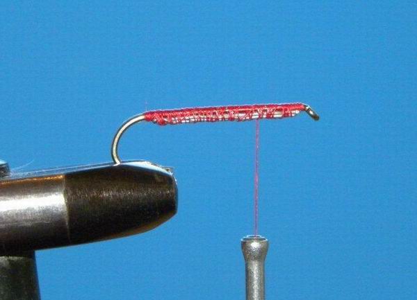 (6) Darüber dann 4 Fäden Krystal Flash. (7) Den Faden mit Polarfuchsunterwolle dubben und eine kleine Verdickung wickeln. |