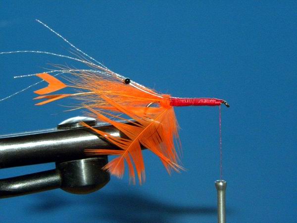 | Zu Beginn jeder Meerforellensaison sitze ich schon Wochen vorher an meinem Bindetisch und fülle meine Fliegenboxen mit neuen oder altbewährten Mustern wieder auf. Eines dieser Fliegenmuster ist diese orange Shrimp-Variante. Vor einigen Jahren hatte ich in einer Zeitschrift eine Bindeanleitung für diesen Shrimp entdeckt. Der Unterschied zu anderen Mustern besteht in der freien Rückenschwinge. Unter Zug entsteht zusammen mit den Scheren und der Hechel eine schöne, lebendige und atmende Silhouette. |