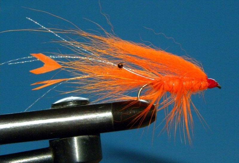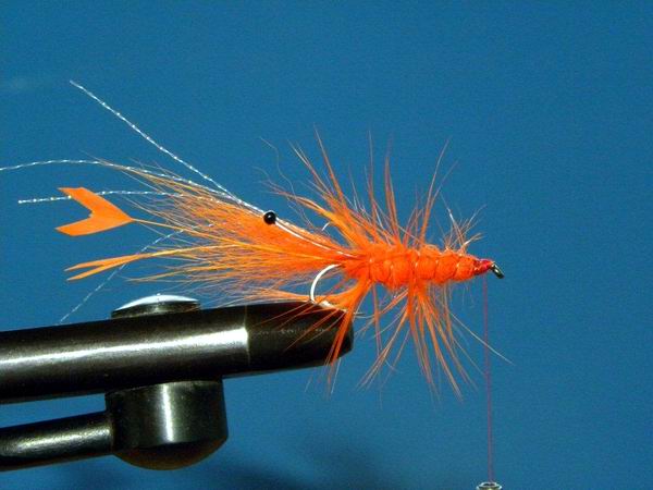 Haken: langschenkliger Streamerhaken Gr. 6-8 Bindefaden: Uni 6/0 rot Beschwerung: Bleidraht Fühler: Polarfuchs orange, Krystal Flash Pearl perlmutt Scheren: Hechelfedern Körper: Polarfuchsdubbing Augen: Monofil 0,50mm angesengt und lackiert Rippung: Kupferdraht Körperhechel: weiche Hennenhechel orange Rücken: Polarfuchs (1) Haken einspannen, den
